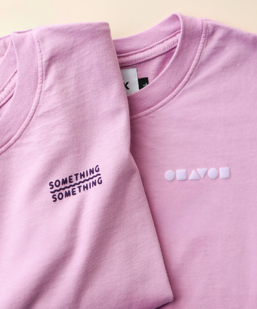 The boxy tee has a relaxed fit through the body and a cut that is tailored through the shoulder and armhole. Fabric is a mid-weight 100% cotton jersey that has been pre-shrunk in the garment dye process. Choose a printed add-on to your boxy tshirt - a little something something in dark purple puff, or an OKAYOK Bauhaus logo in lavender puff.