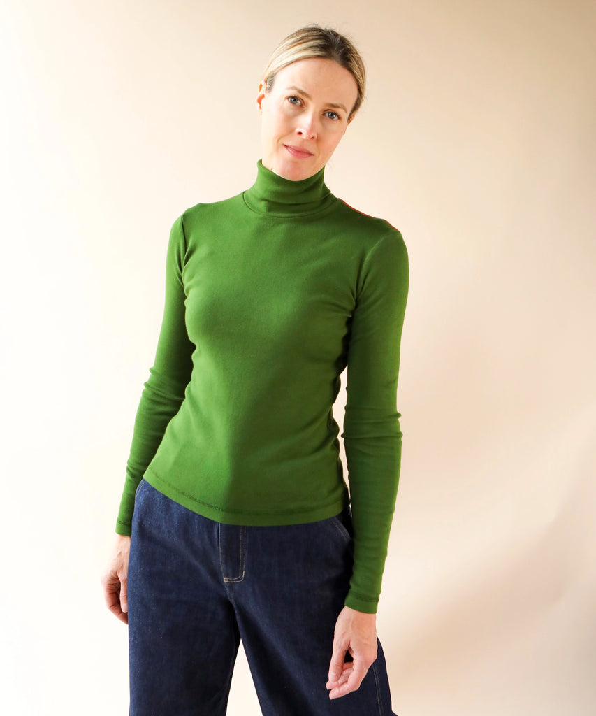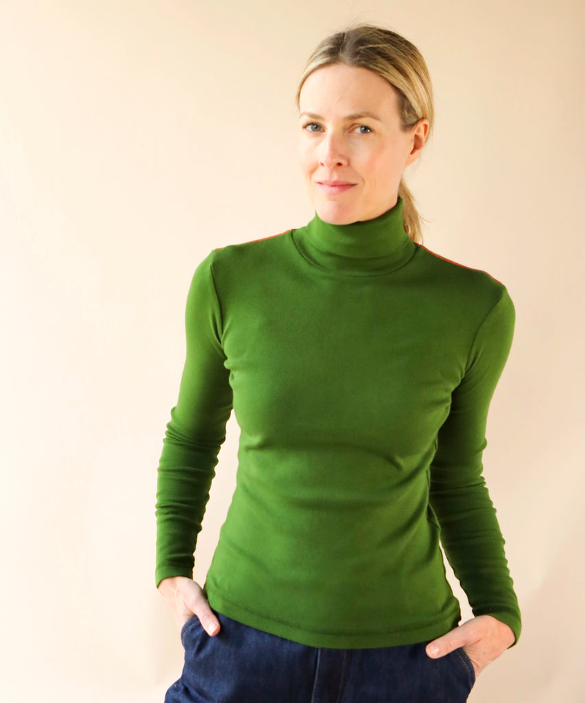 Fitted cotton turtleneck, an ideal layer for fall and winter. Turtlenecks have a neon red stitch detail on the center back and shoulders, and have been garment dyed and pre-shrunk. Baby rib fabric has a soft stretch.