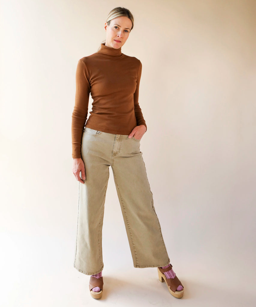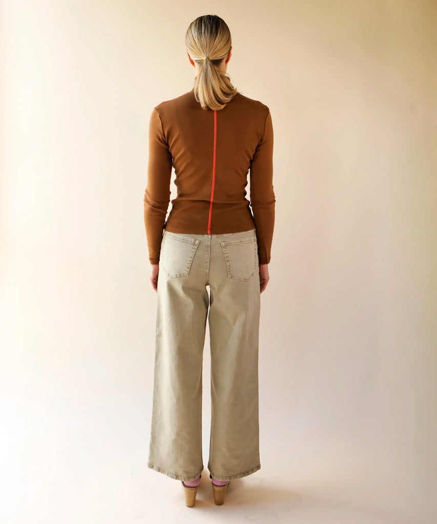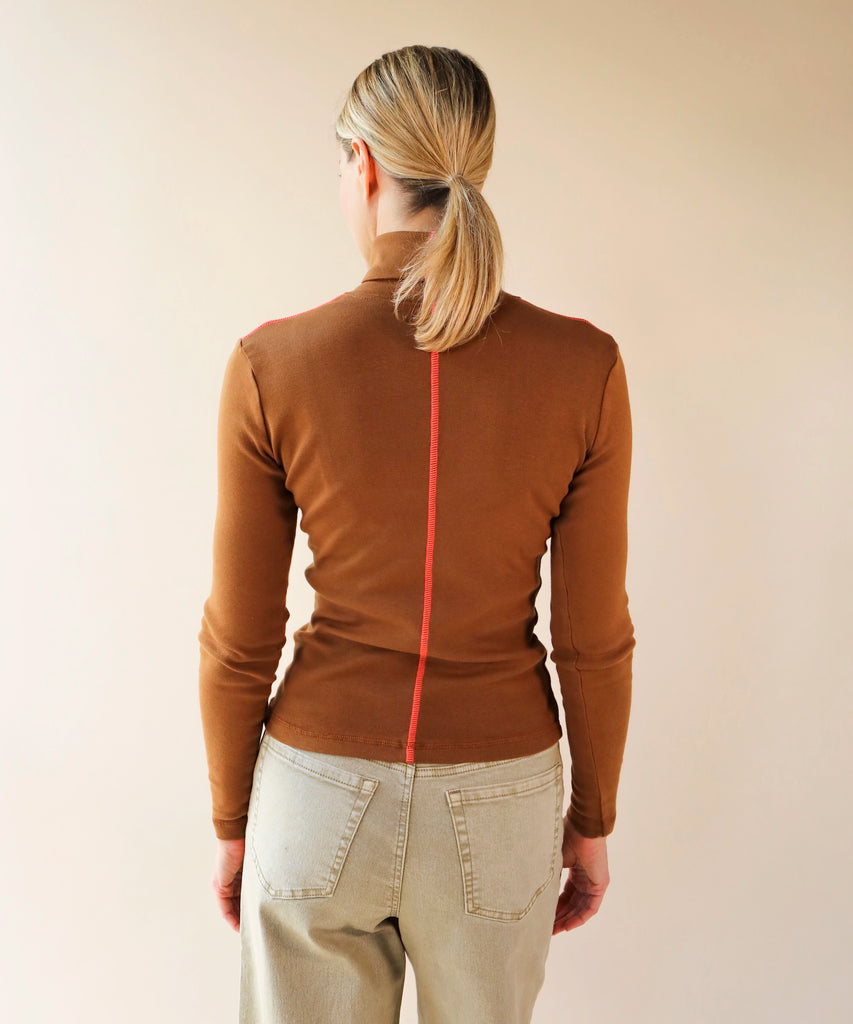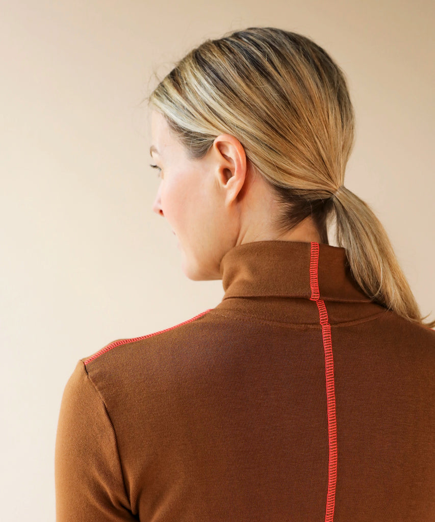 Fitted cotton turtleneck, an ideal layer for fall and winter. Turtlenecks have a neon red stitch detail on the center back and shoulders, and have been garment dyed and pre-shrunk. Baby rib fabric has a soft stretch.