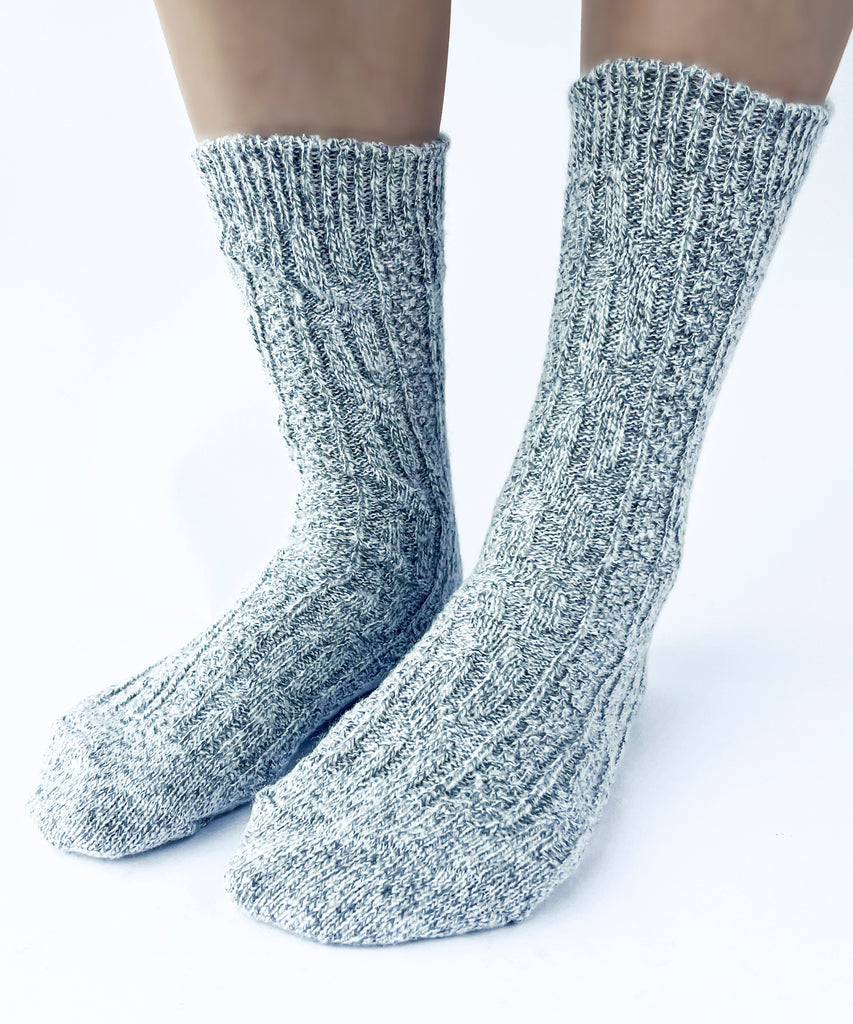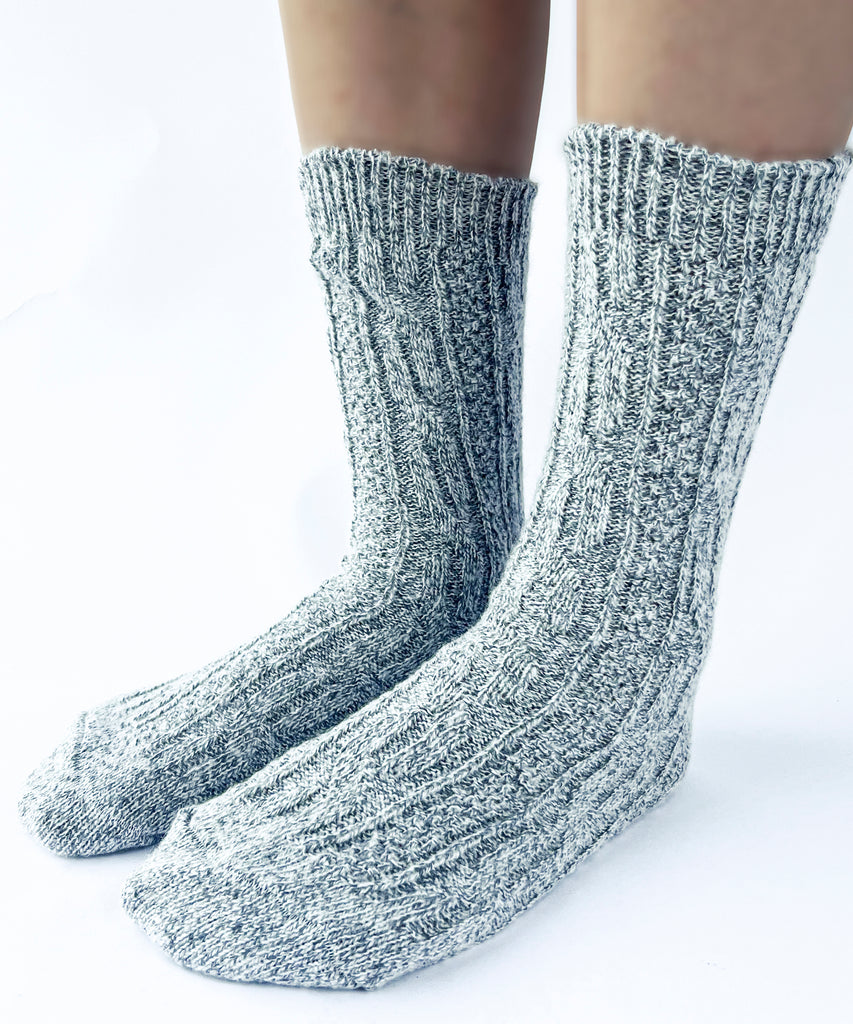 Blended fiber Jenny socks made of a twisted yarn of recycled cotton and loopy bouclé, creating a soft and cozy sock for fall and winter. Jenny socks have a chunky cable knit texture.