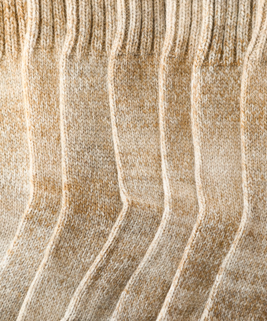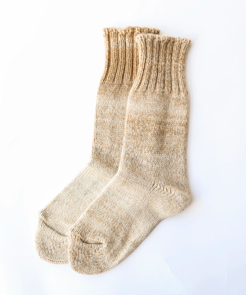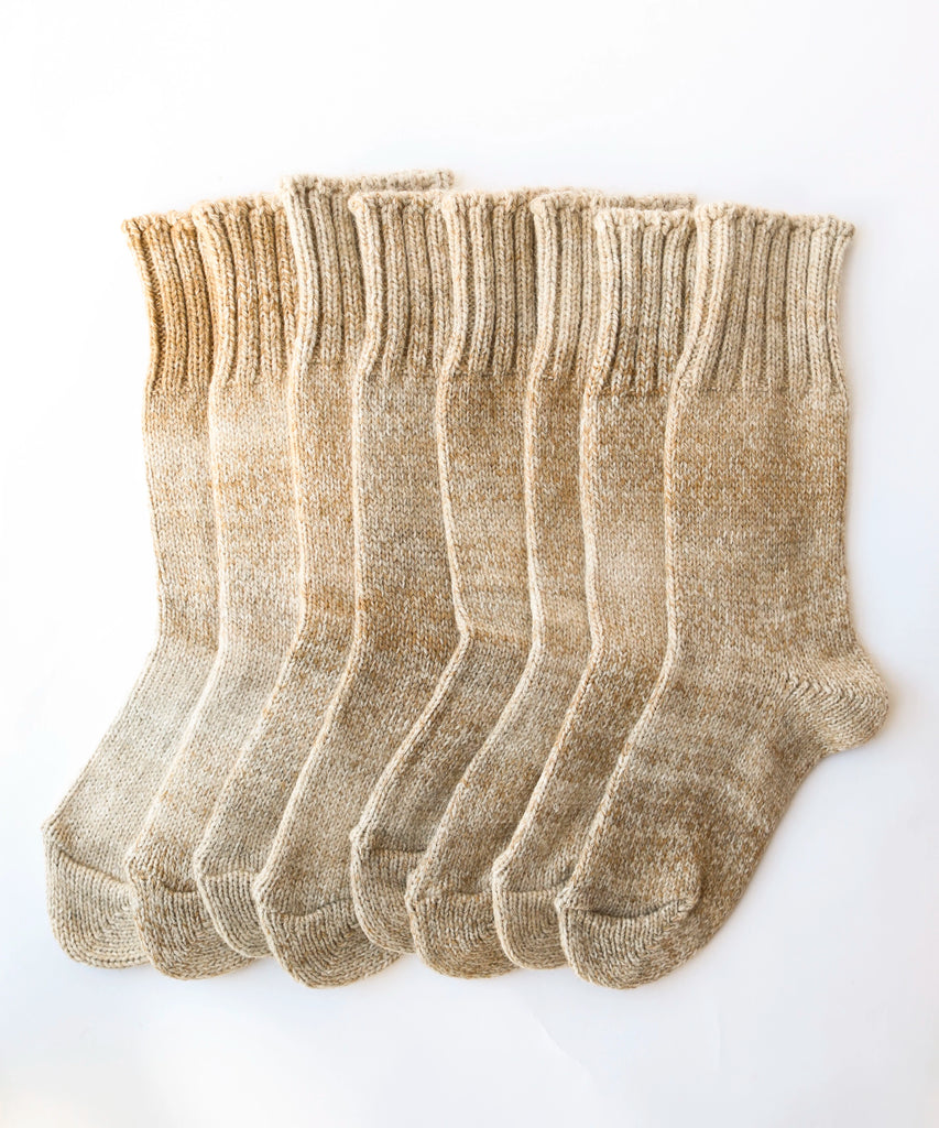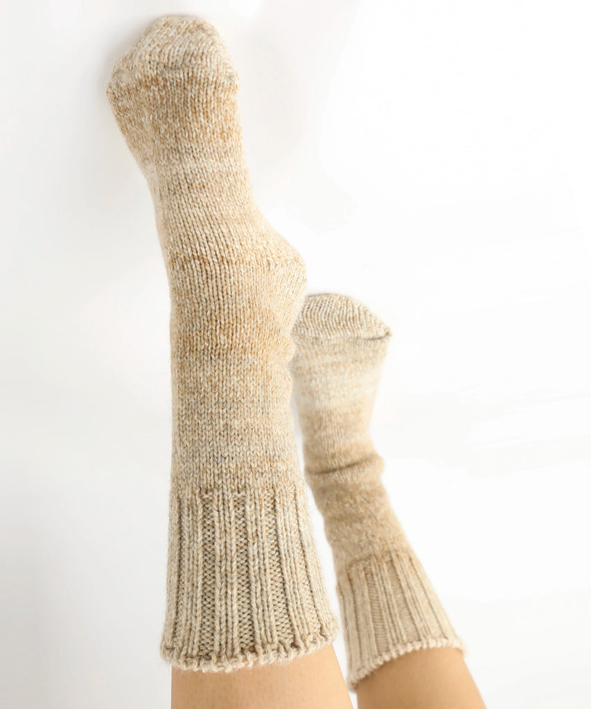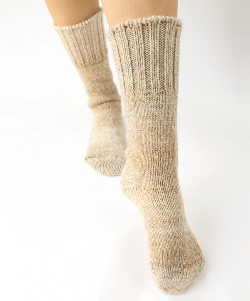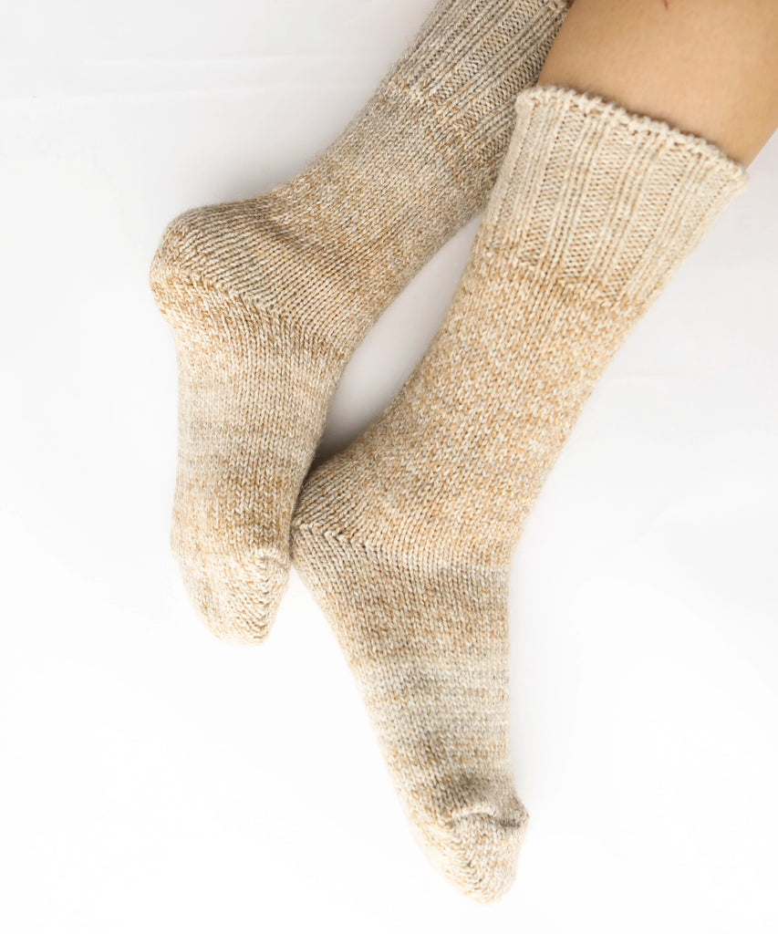 Thick and warm wool-blend socks, made with variegated yarns that create an unpredictable pattern throughout. We did our best to match them, but each sock has its own mix of colour and pattern. Socks contain no elastic, and have a looser fit.