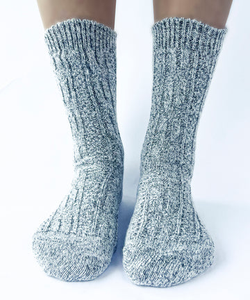 Blended fiber Jenny socks made of a twisted yarn of recycled cotton and loopy bouclé, creating a soft and cozy sock for fall and winter. Jenny socks have a chunky cable knit texture.
