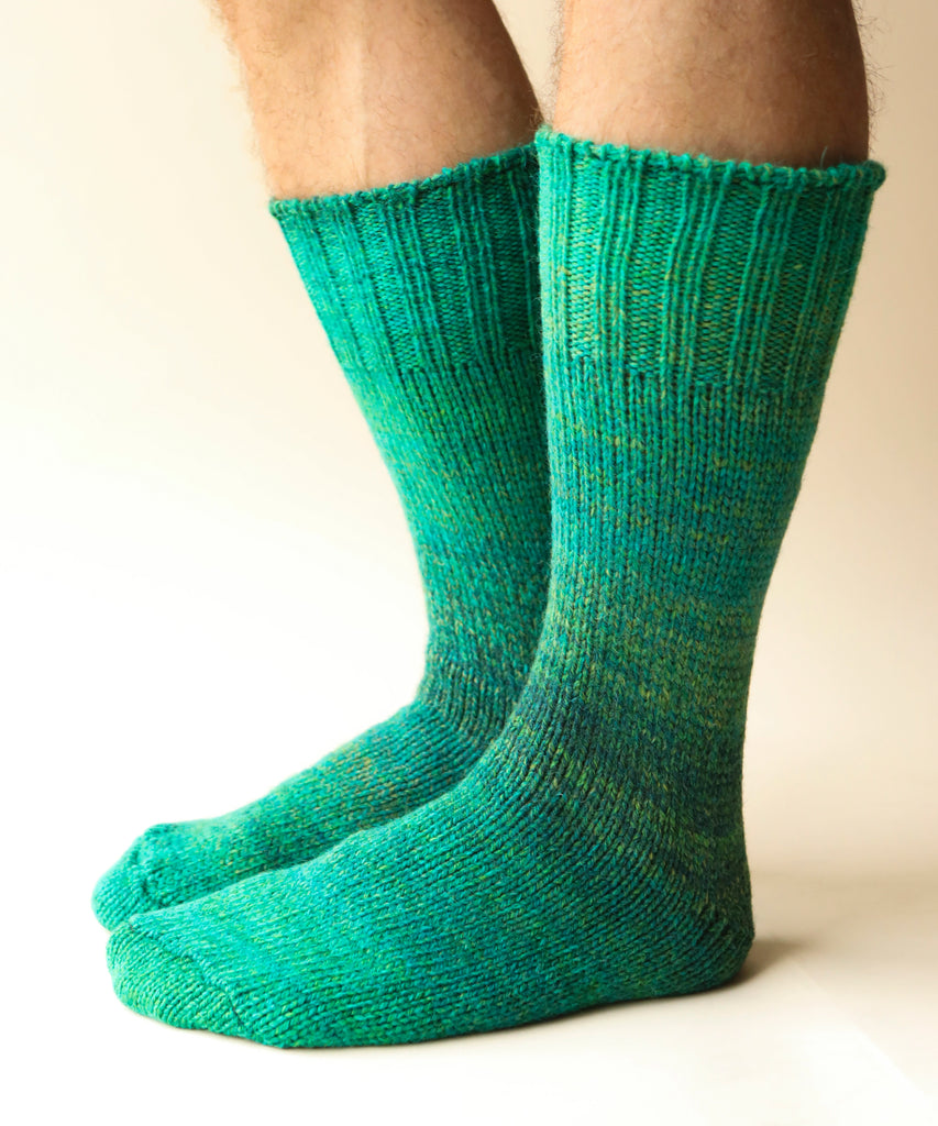 Thick and warm wool-blend socks, made with variegated yarns that create an unpredictable pattern throughout. Socks contain no elastic, and have a looser fit.