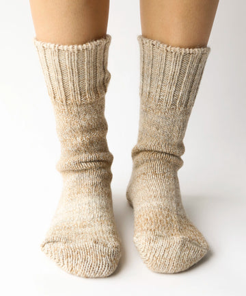Thick and warm wool-blend socks, made with variegated yarns that create an unpredictable pattern throughout. We did our best to match them, but each sock has its own mix of colour and pattern. Socks contain no elastic, and have a looser fit.