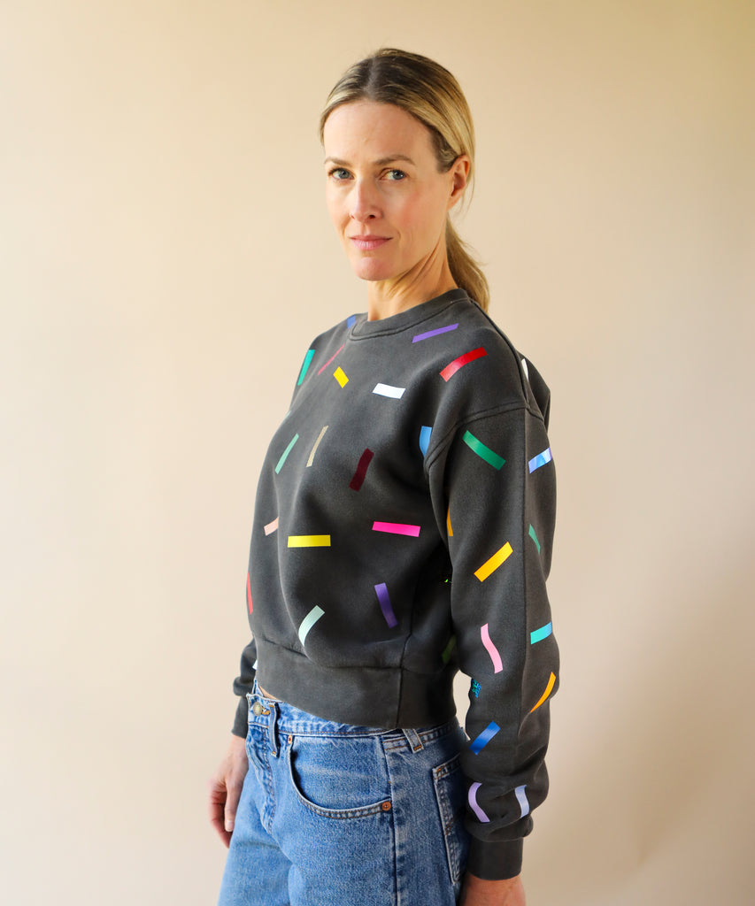Multi coloured confetti on a moody grey pigment dyed laine sweatshirt. Laine has a relaxed, wedge shape and longer cropped length. The confetti design is hand arranged on the garment and no two shirts are the same.