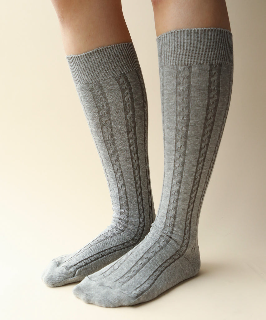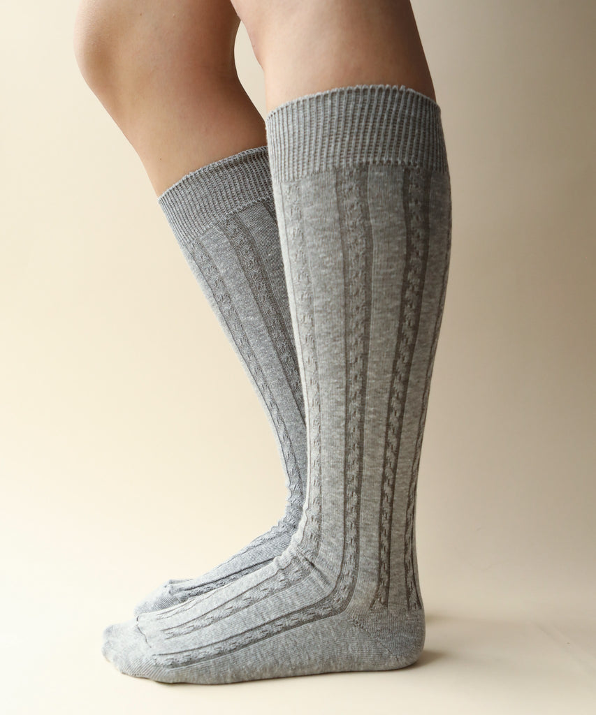 Cable knit knee highs are an understated fashion statement to wear under your trousers, or with your shortest kilt. Socks are knit with two yarn shades to enhance the cable textures.