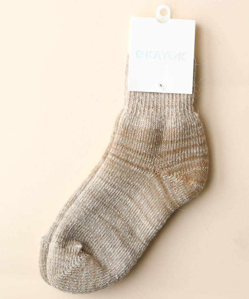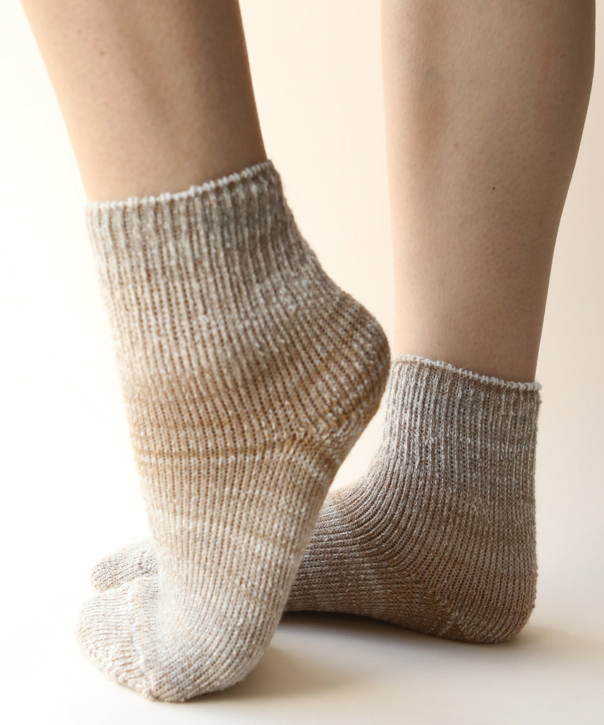 Ankle length wool-blend socks with soft and fluffy interior. Made with variegated yarns that create an unpredictable pattern throughout. Each sock has its own mix of colour and pattern and the pair may not be an exact match.